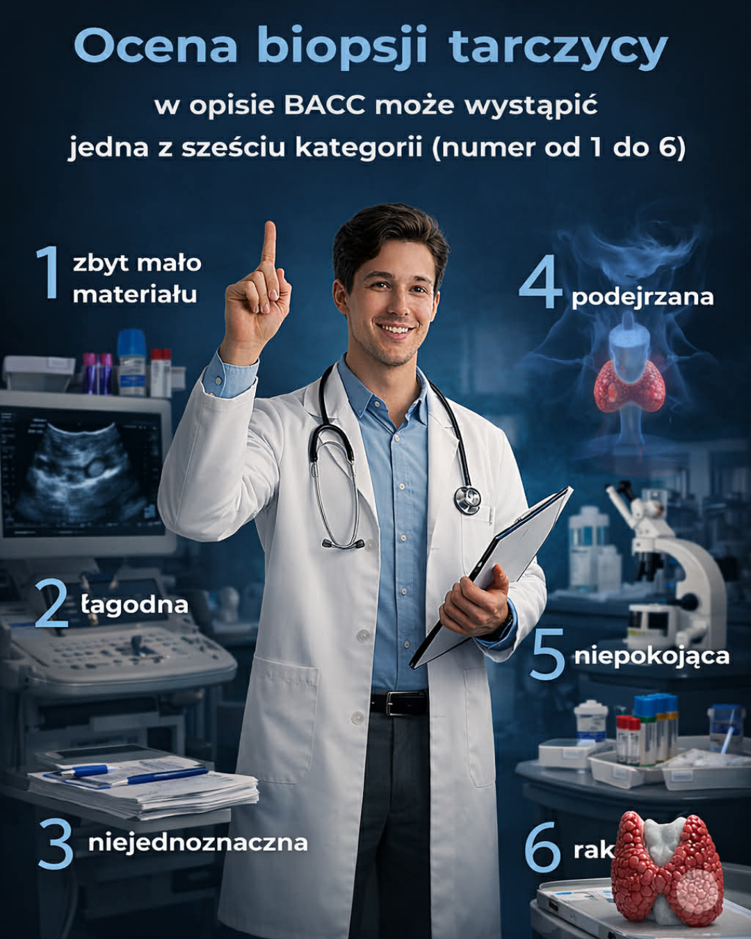 Wyniki biopsji tarczycy opisywane są według sześciostopniowej skali Bethesda: